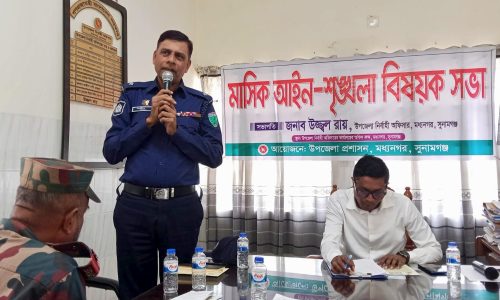 সুরঞ্জন তালুকদার (মধ্যনগর প্রতিনিধি): সুনামগঞ্জের মধ্যনগরে মাসিক আইন-শৃঙ্খলা বিষয়ক সভা অনুষ্ঠিত হয়েছে। এতে সভাপতিত্ব করেন উপজেলা নির্বাহী কর্মকর্তা (ইউএনও) উজ্জ্বল…