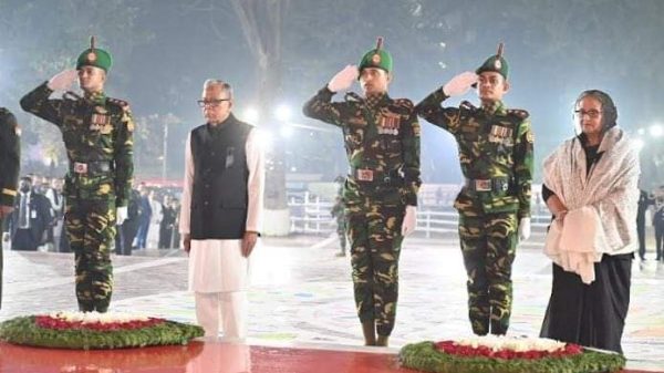 রাষ্ট্র এবং সরকার প্রধান উভয়েই আজ রাত ১২টা এক মিনিটে কেন্দ্রীয় শহীদ মিনারে পুষ্পস্তবক অর্পণ করেন।