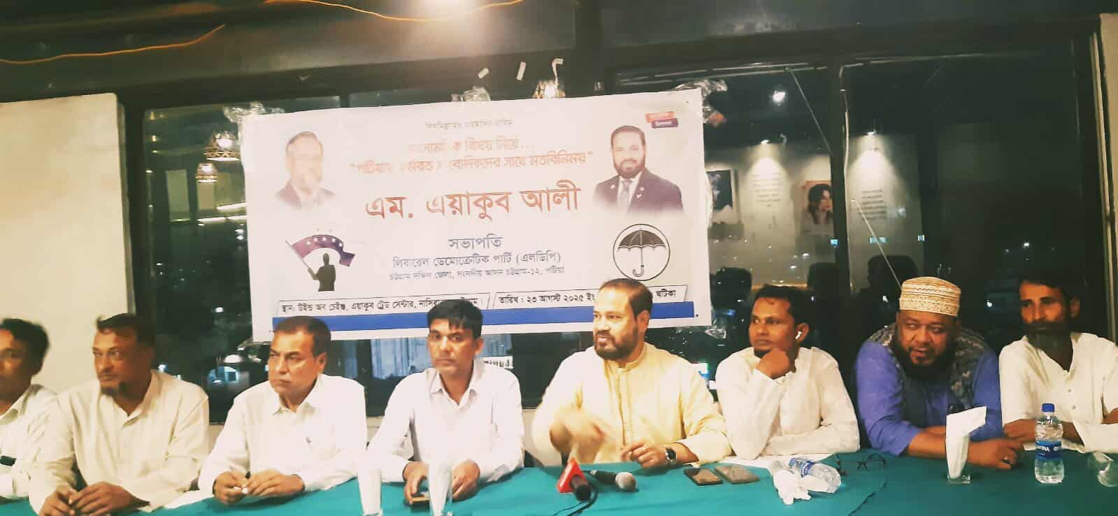চট্টগ্রামে ১২ (পটিয়া আসনের) বিএনপির নেতৃত্বে সমমনা জোটের মনোনয়ন প্রত্যাশী চট্টগ্রাম দক্ষিণ জেলা এলডিপি’র সভাপতি বিশিষ্ট শিল্পপতি এম.এয়াকুব আলী বলেছেন পটিয়ার হারোনো গৌরব, ইতিহাস, ঐতিহ্য, সংস্কৃতি মর্যাদা ফিরিয়ে আনা হবে। এম এয়াকুব আলী ২৩ আগষ্ট শনিবার সন্ধায় নগরীর নাসিরাবাদ নিজ বানিজ্যিক ভবনে দলীয় কার্য়লয়ে পটিয়ার কর্মরত সাংবাদিকদের সাথে মতবিনিময়কালে উপরোক্ত কথাগুলো বলেন।এসময় তার সাথে উপস্থিত ছিলেন দক্ষিণ জেলা এলডিপি’র সাংগঠনিক সম্পাদক ও পটিয়া উপজেলার সভাপতি মনসুর আলম, দক্ষিণ জেলা এলডিপি’র দপ্তর সম্পাদক ও পটিয়া উপজেলার সাধারণ সম্পাদক মোহাম্মদ আইয়ুব আলী, দক্ষিণ জেলা গনতান্ত্রিক যুবদলের সাধারণ সম্পাদক আবদুল কুদ্দুস চৌধুরী, পটিয়া পৌরসভা এলডিপি’র যুগ্ম আহবায়ক ডাক্তার রিদোয়ান আজাদ, যুগ্ম আহবায়ক ও সদর বনিক সমিতির সভাপতি গাজী আমির হোসেন, সদস্য সচিব সাবেক ছাএনেতা মুজিবুর রহমান, উপজেলা এলডিপি’র যুগ্ম সম্পাদক মোহাম্মদ নাদের জামান প্রমুখ।