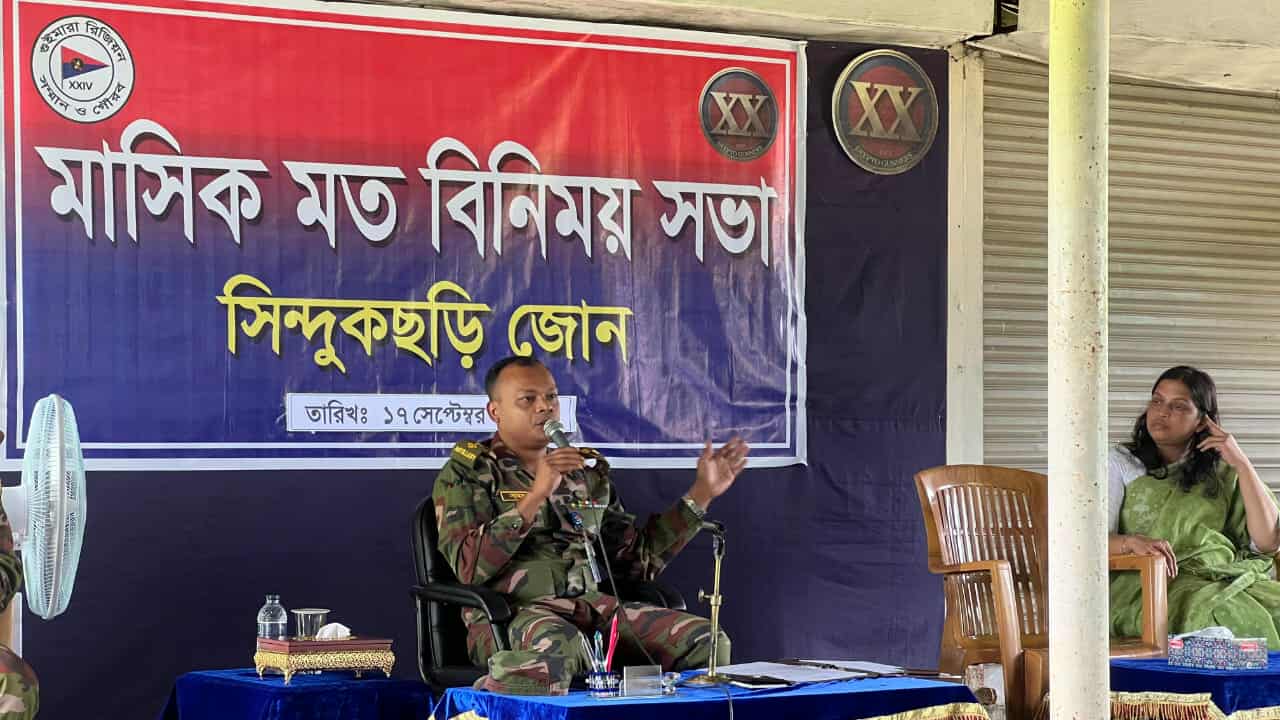 পার্বত্য জেলা খাগড়াছড়ির গুইমারার সিন্দুকছড়ি জোনের আয়োজনে মাসিক মতবিনিময় সভা অনুষ্ঠিত হয়। ১৭ সেপ্টেম্বর-২০২৫ খ্রি. বুধবার বেলা ১২ টায় সিন্দুকছড়ি জোন সদরে মাল্টিপারপাস শেডে মতবিনিময় সভা অনুষ্ঠিত হয়। ২০ ফিল্ড রেজিঃ আর্টিঃ সিন্দুকছড়ি জোন কমান্ডার বিএ- ৭৫১৪ লে. কর্ণেল ইসমাইল সামস আজিজি, পিএসসি, জি’র সভাপতিত্বে উক্ত সভায় উপস্থিত ছিলেন গুইমারা উপজেলা নির্বাহী অফিসার আইরিন আক্তার, মানিকছড়ি উপজেলা অফিসার তাহমিনা আফরোজ ভূঁইয়া, খাগড়াছড়ি পার্বত্য জেলা পরিষদের সদস্য, সাথোয়াইপ্রু মারমা, গুইমারা উপজেলা বিএনপি’র সভাপতি সাইফুল ইসলাম সোহাগ, মানিকছড়ি উপজেলা বিএনপি’র সভাপতি এনামুল হক এনাম, গুইমারা উপজেলা ইসলামী আন্দোলন’র সভাপতি মো. মাগফার, মানিকছড়ি গিরি মৈত্রী ডিগ্রী কলেজ অধ্যক্ষ মো. শাহ আলম, মানিকছড়ি থানার ওসি, মাহমুদুল হাসান, গুইমারা থানার ওসি এনামুল হক চৌধুরী, গচ্ছাবিল আনসার ব্যাটালিয়ন অধিনায়ক মো. দেওয়ান মাতাব্বর, বন বিভাগের প্রতিনিধি, মানিকছড়ি ও গুইমারার প্রেসক্লাবের সভাপতি এবং সাধারণ সম্পাদকগণ এ সময় উপস্থিত ছিলেন। এ ছাড়া গুইমারা ও মানিকছড়ি ইউনিয়নের ইউপি চেয়ারম্যান, ইউপি সদস্য, বিভিন্ন সরকারি বেসরকারি দপ্তরের কর্মকর্তা, হেডম্যান, কারবারি ও সাংবাদিক, বাজার কমিটিসহ স্থানীয় গণ্যমান্য ব্যক্তিবর্গ উপস্থিত ছিলেন।