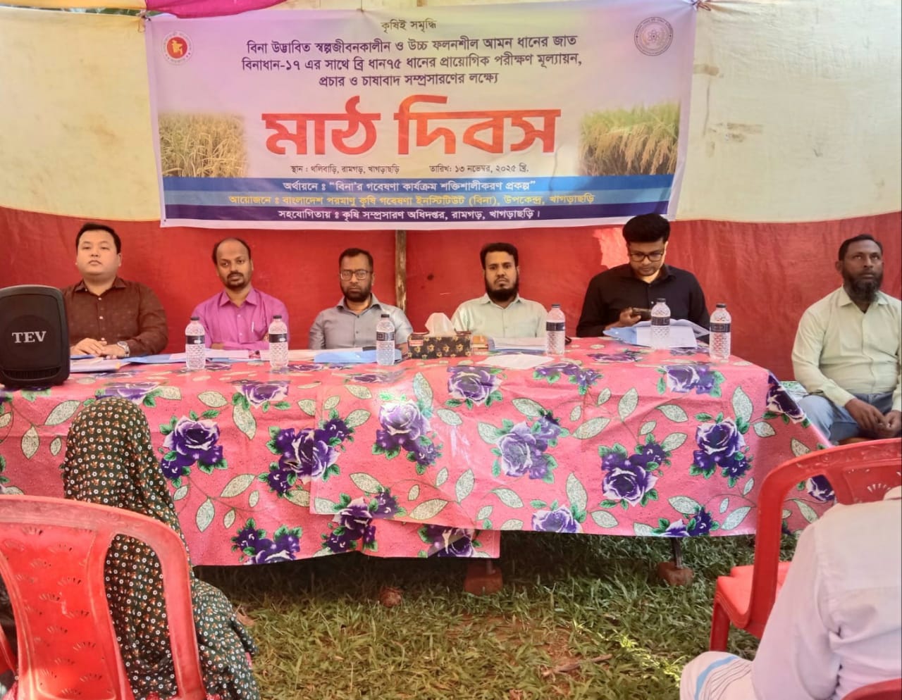 খাগড়াছড়ির রামগড়ে বিনাধান-১৭ এর সঙ্গে ব্রি ধান- ৭৫ এর প্রয়োগিক পরীক্ষণ মূল্যায়নে প্রচার ও চাষাবাদ সম্প্রসারণের লক্ষ্যে মাঠ দিবস অনুষ্ঠিত হয়েছে।