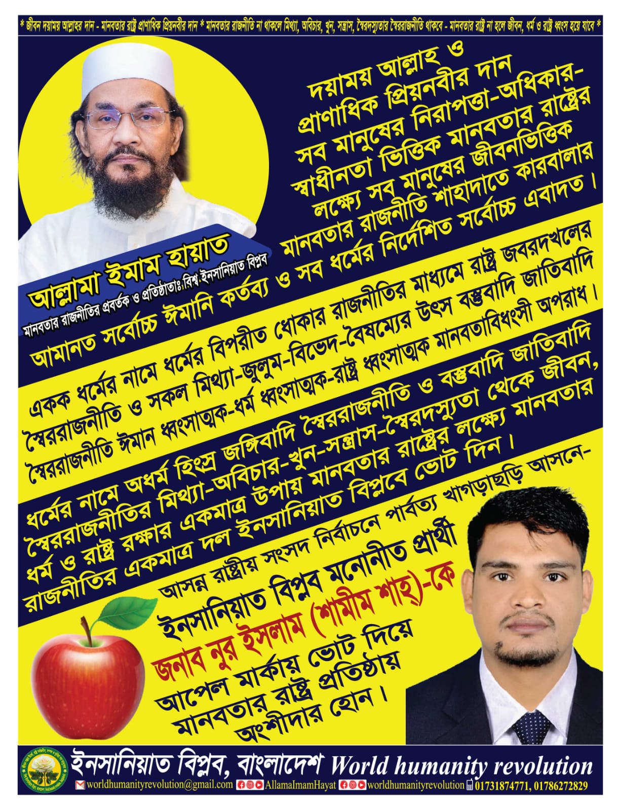 আসন্ন ত্রায়োদশ রাষ্ট্রীয় সংসদ নির্বাচনে পার্বত্য খাগড়াছড়ি ২৯৮ সংসদীয় আসনে সত্য ও মানবতার পরম বন্ধু আল্লামা ইমাম হায়াত প্রবর্তিত ইনসানিয়াত বিপ্লব বাংলাদেশ এর আপেল মার্কার মনোনীত প্রার্থী নুর ইসলাম শামীম শাহ্।