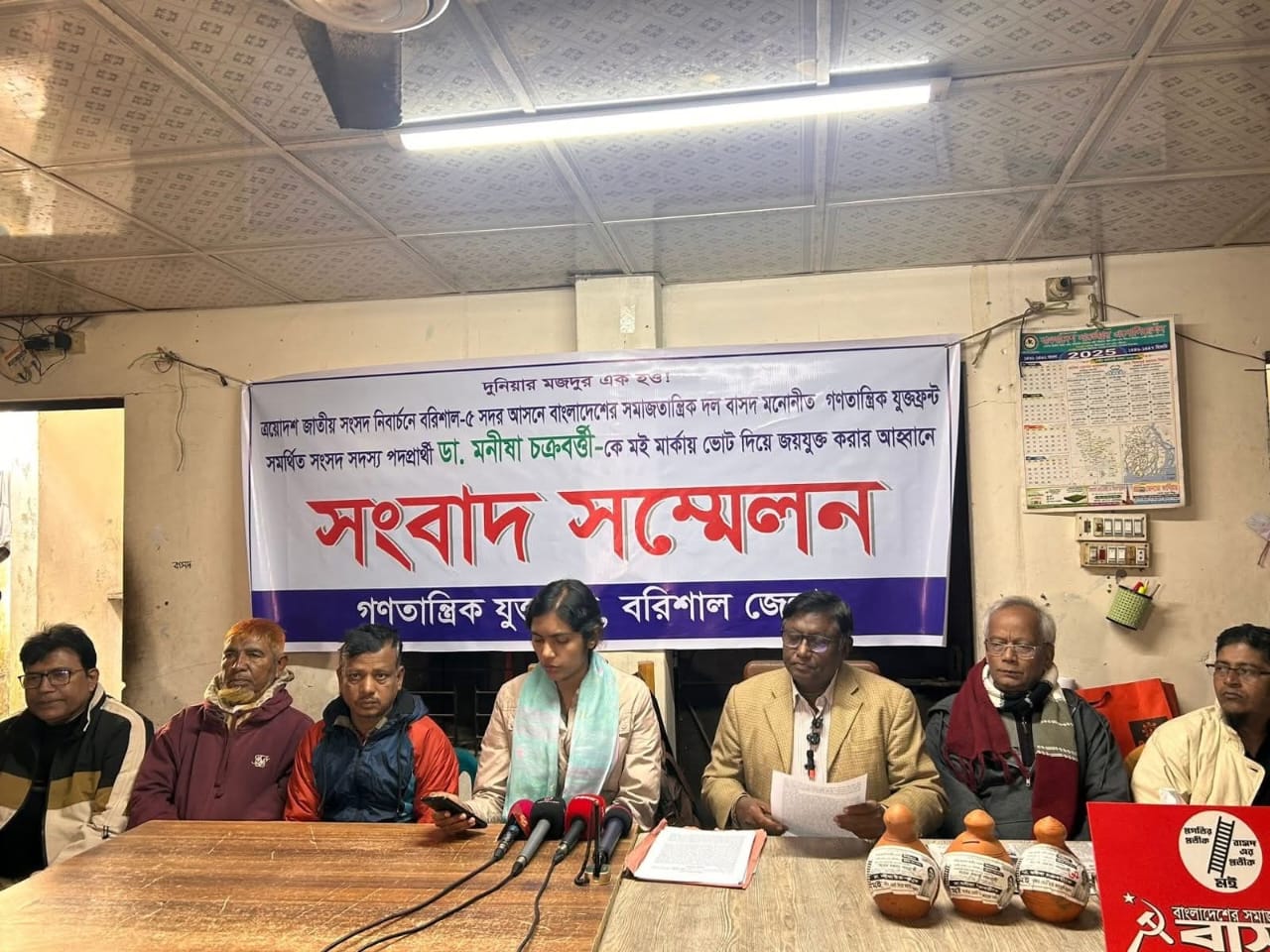 বরিশাল-৫ আসনে বাসদ মনোনীত সংসদ সদস্য পদপ্রার্থী ডাক্তার মনীষাকে সমর্থন জানিয়ে গণতান্ত্রিক যুক্ত ফ্রন্টের সংবাদ সম্মেলন অনুষ্ঠিত হয়েছে।