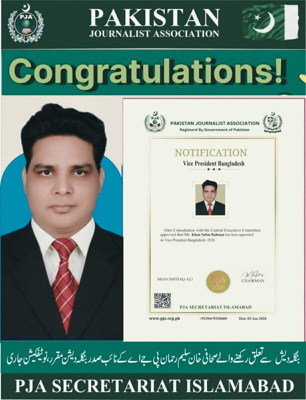 সোমবার (৫ জানুয়ারি) পাকিস্তান জার্নালিস্ট অ্যাসোসিয়েশনের অফিসিয়াল ফেসবুক পেজ ও এক প্রেস বিজ্ঞপ্তির মাধ্যমে খান সেলিম রহমানকে আনুষ্ঠানিকভাবে অভিনন্দন জানানো হয়। বিজ্ঞপ্তিতে তাঁর পেশাগত অবদান, নেতৃত্বের গুণাবলি এবং আন্তর্জাতিক সাংবাদিকতার ক্ষেত্রে ভূমিকার ভূয়সী প্রশংসা করা হয়।