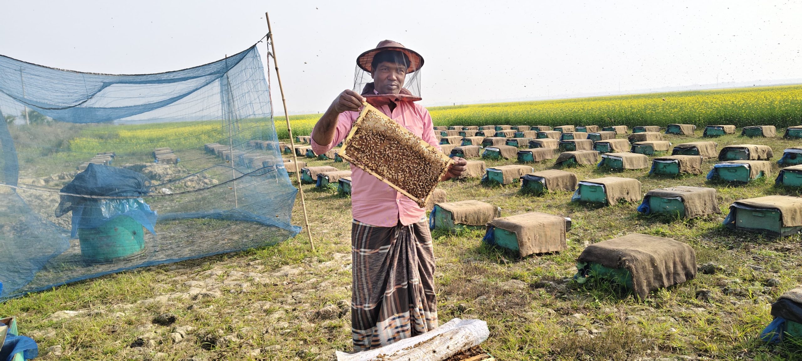 ছবি: পাবনার ভাঙ্গুড়া উপজেলার দিলপাশার ইউনিয়নের বেতুয়ান গ্রামে সরিষা ক্ষেতে মৌচাষিরা ব্যস্ত সময় পার করছেন মধু সংগ্রহে।